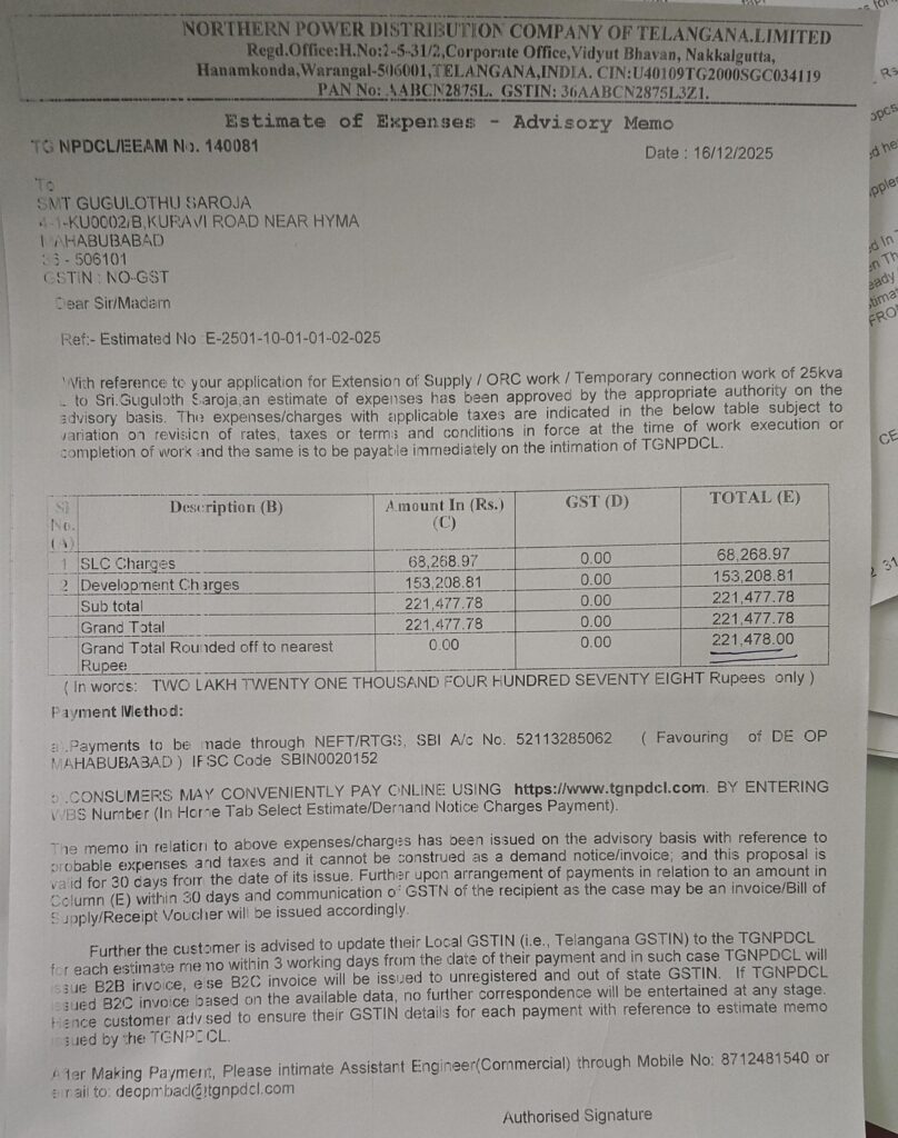 జిల్లాలో రూల్స్ కి విరుద్ధంగా పనులు చేయాలని లేనిపక్షంలో మా గిరిజన సంఘాల ద్వారా మీ అంతుచుస్తామనే రీతిలో కొంతమంది మా పై వత్తిడి చేస్తున్నారని విద్యుత్ అసిస్టెంట్ ఇంజనీర్ శ్రీరామ్ హరీష్…. అన్నారు ఇంటి విద్యుత్ కనెక్షన్ కోసం జరుగుతున్న ఆందోళనపై వివరణ కోసం తోవ్వ వెళ్లగా ఆయన తెలిపిన వివరాల ప్రకారం16-11-2025 రోజున గుగులోత్ సరోజా అనే వినియోగదారుడి పేరుపై ఇంటి విద్యుత్ కనెక్షన్ కోసం దరఖాస్తు వచ్చింది. వారి ఇంటికి లైన్ దూరంగా ఉండటం వలన అంచనా (Estimate) తయారు చేసి 16-12-2025 నాడు డిమాండ్ నోటీస్ Rs2,21,478 /- ఇచ్చాము.కానీ గిరిజన సంఘం నాయకుడు భీమ నాయక్ డిమాండ్ నోటీస్ ప్రకారం డబ్బు చెల్లించకుండా, హైమా గార్డెన్ నుండి అక్రమంగా లైన్ తీసుకోవాలని నాపై ఒత్తిడి చేశాడని. హైమా గార్డెన్ వారు దీనికి ఒప్పుకోలేదు. అందువల్ల వారు అంగీకరిస్తే రాతపూర్వకంగా ఇవ్వమని నేను చెప్పాను.దీంతో ఆగ్రహించిన భీమ నాయక్ నాపై దాడి చేయడానికి ప్రయత్నించాడు, దురుసుగా మాట్లాడాడు మరియు నా విధులను అడ్డుకునే ప్రయత్నం చేశాడు. నేను భయంతో పోలీస్ స్టేషన్కు వెళ్లి ఫిర్యాదు చేయడానికి ప్రయత్నించాను ఆందోళన లో అర్ధం లేదు…గిరిజన బూచి చూపిస్తూ అధికారులను బెదిరిస్తున్నారా….విద్యుత్ అసిస్టెంట్ ఇంజనీర్ శ్రీరామ్ హరీష్….తోవ్వ, ప్రతినిధి.డిసెంబర్ 31;జిల్లాలో రూల్స్ కి విరుద్ధంగా పనులు చేయాలని లేనిపక్షంలో మా గిరిజన సంఘాల ద్వారా మీ అంతుచుస్తామనే రీతిలో కొంతమంది మా పై వత్తిడి చేస్తున్నారని విద్యుత్ అసిస్టెంట్ ఇంజనీర్ శ్రీరామ్ హరీష్…. అన్నారు ఇంటి విద్యుత్ కనెక్షన్ కోసం జరుగుతున్న ఆందోళనపై వివరణ కోసం తోవ్వ వెళ్లగా ఆయన తెలిపిన వివరాల ప్రకారం16-11-2025 రోజున గుగులోత్ సరోజా అనే వినియోగదారుడి పేరుపై ఇంటి విద్యుత్ కనెక్షన్ కోసం దరఖాస్తు వచ్చింది. వారి ఇంటికి లైన్ దూరంగా ఉండటం వలన అంచనా (Estimate) తయారు చేసి 16-12-2025 నాడు డిమాండ్ నోటీస్ Rs2,21,478 /- ఇచ్చాము.కానీ గిరిజన సంఘం నాయకుడు భీమ నాయక్ డిమాండ్ నోటీస్ ప్రకారం డబ్బు చెల్లించకుండా, హైమా గార్డెన్ నుండి అక్రమంగా లైన్ తీసుకోవాలని నాపై ఒత్తిడి చేశాడని. హైమా గార్డెన్ వారు దీనికి ఒప్పుకోలేదు. అందువల్ల వారు అంగీకరిస్తే రాతపూర్వకంగా ఇవ్వమని నేను చెప్పాను.దీంతో ఆగ్రహించిన భీమ నాయక్ నాపై దాడి చేయడానికి ప్రయత్నించాడు, దురుసుగా మాట్లాడాడు మరియు నా విధులను అడ్డుకునే ప్రయత్నం చేశాడు. నేను భయంతో పోలీస్ స్టేషన్కు వెళ్లి ఫిర్యాదు చేయడానికి ప్రయత్నించాను.పోలీస్ స్టేషన్లో కూడా భీమ నాయక్ వచ్చి ఎస్ఐ దురుసుగా మాట్లాడాడు, పోలీసుల విధులను కూడా అడ్డుకున్నాడు. ఈ విషయాన్ని గమనించిన పోలీసులు స్వయంగా ఫీల్డ్ తీసుకొని కేసు నమోదు చేశారు మరియు అతనే అసభ్య కరకంగా మా మీద మాట్లాడి, మేము 